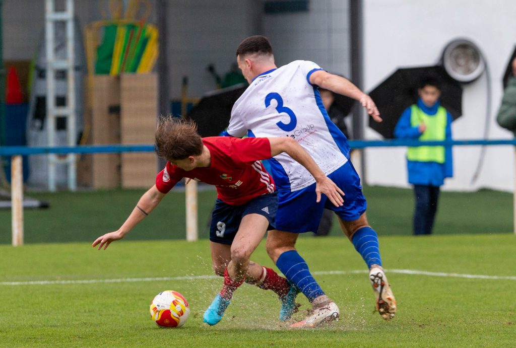 En un día de lluvia infernal se juega en un campo muy blando de hierba natural donde se aprecian zonas con charcos grandes y que claro condicionará mucho el juego sobre todo en el transcurso del encuentro. La salida de los locales es de ritmo violento y pretender desnivelar desde el primer minuto, pese que los rojillos están prevenidos de esa fuerte salida. Así en un saque de banda al área, atrapa el delantero local, la baja y la pone dentro del área pequeña y el fuerte disparo posterior menos mal que el defensa Joel Martínez llega para interponerse. Antes del primer cuarto de hora, dos jugadores rojillos son amonestados lo que les impedirá poner toda la intensidad más adelante.